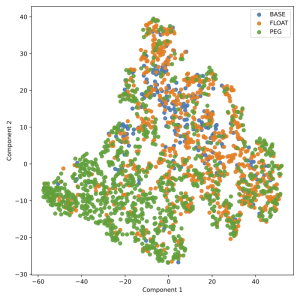 The figure visualizes the output of the t-stochastic nearest neighbors (t-SNE) algorithm applied to the exchange rate, U.S. dollar and international trade text features for 21 central banks. We construct three categories for the visualization: “base” currencies in blue (U.S. dollar/Federal Reserve System, Euro/ECB), floating currencies in orange, and pegged currencies in green.