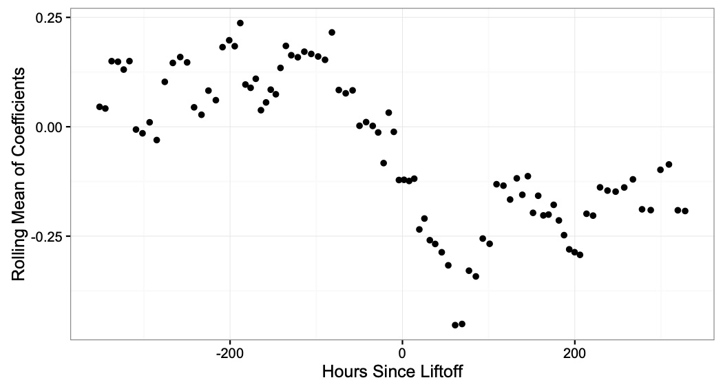 The figure plots the time trend in the interest rate after controlling for loan and borrower composition. We recover the trend by performing a regression of the interest rate on all loan-borrower controls and computing the means of the residuals for all loans posted in the same hour. Finally, we plot the three-cohort rolling mean of the cohort-specific means over a ±14-day window around liftoff.