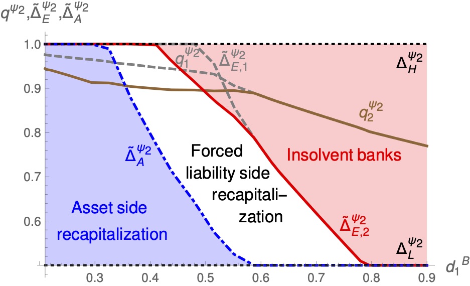 This figure depicts for a given level of leverage (horizontal axis) the market-clearing price for specialized investment capital and the threshold level of bank portfolio risk below which liability side recapitalizations (red) and asset side recapitalizations (blue) are feasible.